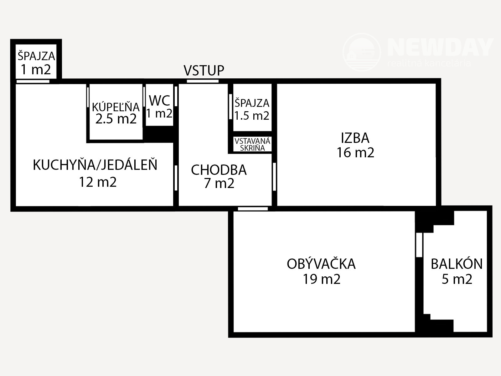 Dispozične byt pozostáva z priestrannej chodby v tvare "L", z ktorej je možné vojsť ihneď po ľavej strane do kambalu, po pravej strane do toalety priamo prepojenej s kúpeľňou, ktorá je priechodná smerom do severozápadne orientovanej kuchyne, do ktorej sa dá vstúpiť aj ďalším samostatným vchodom z chodby. V ďalšej časti chodby sú vstupy do dvoch juhovýchodne orientovaných nepriechodných obytných izieb - do spálne a do obývacej izby s balkónom.