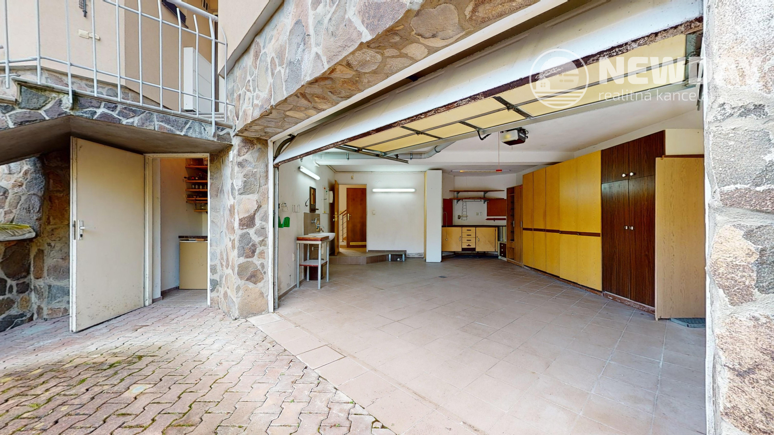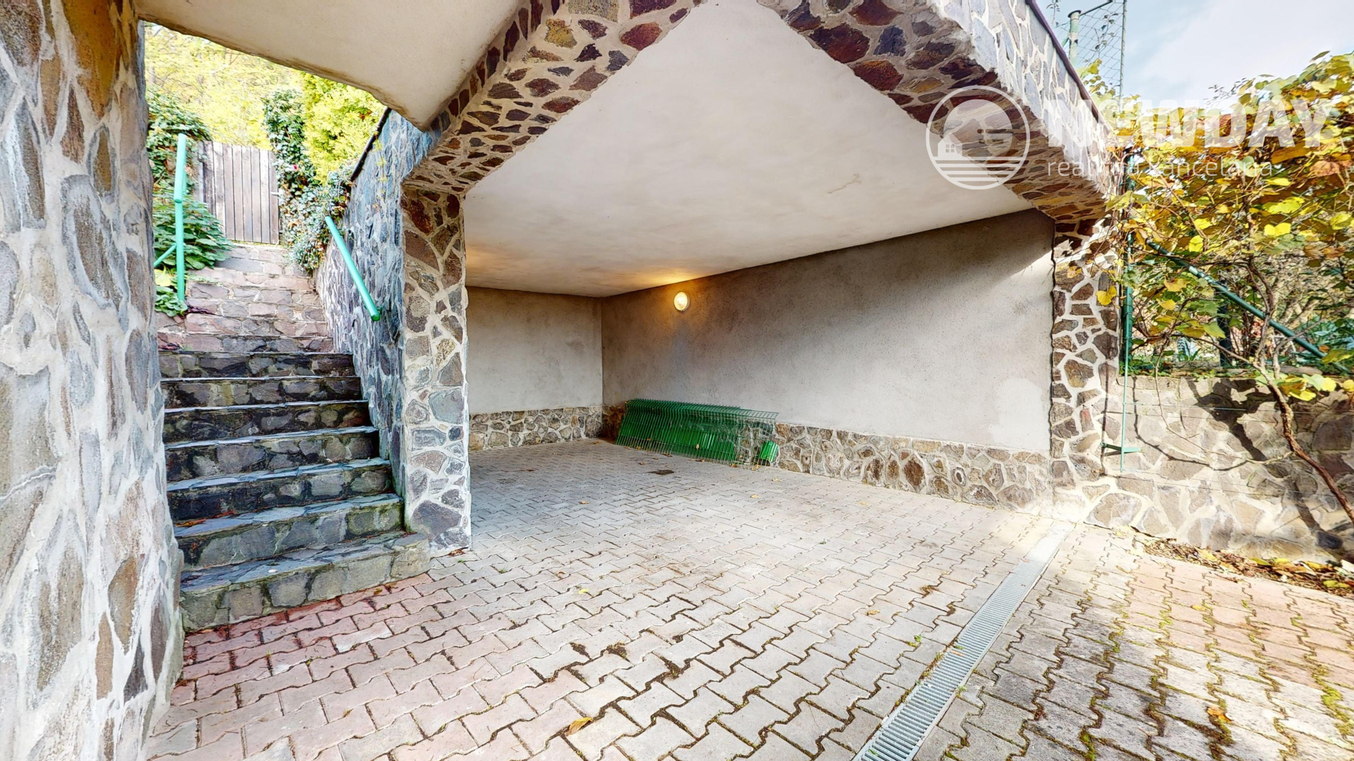 K domu vedie približne 80 m dlhá súkromná ulička so zámkovou dlažbou zdieľaná spoločne tromi domami a oddelená od hlavnej ulice elektrickou bránou na diaľkové ovládanie. Pred domom sa nachádza murovaný prístrešok na parkovanie so zelenou strechou. Zvonku je možné vstúpiť na úrovni I. PP do malého skladu pod schodmi, do pivnice a napokon aj do domu buď cez veľkú priechodnú garáž alebo hlavným vstupom (I. NP), ku ktorému Vás dovedie vonkajšie schodisko.