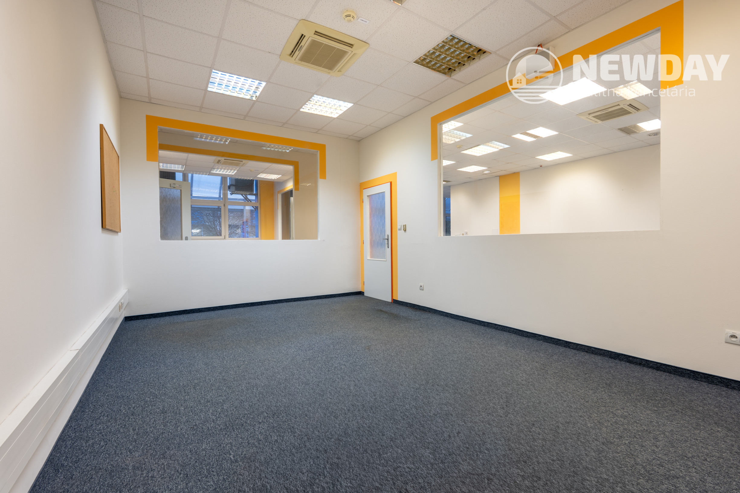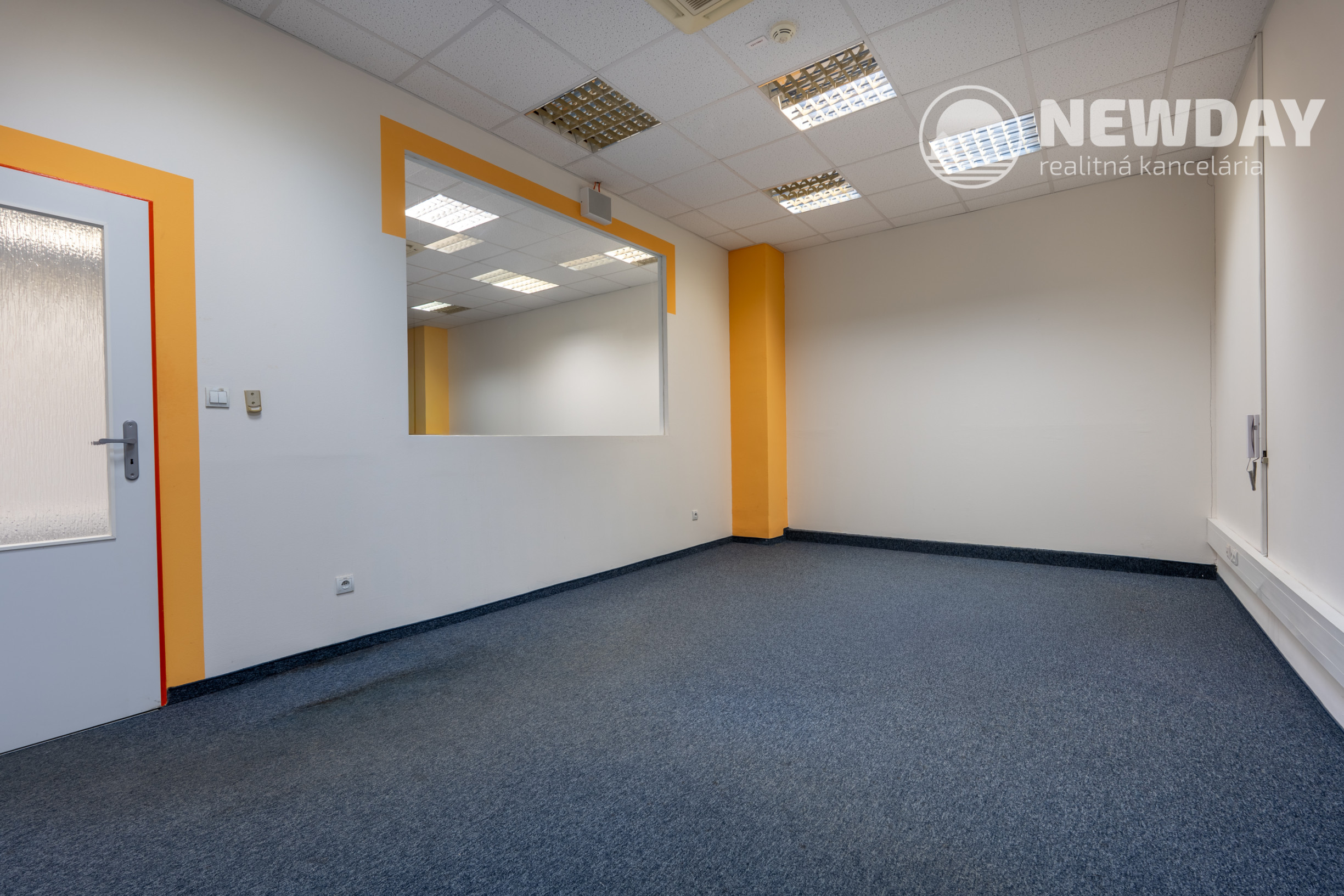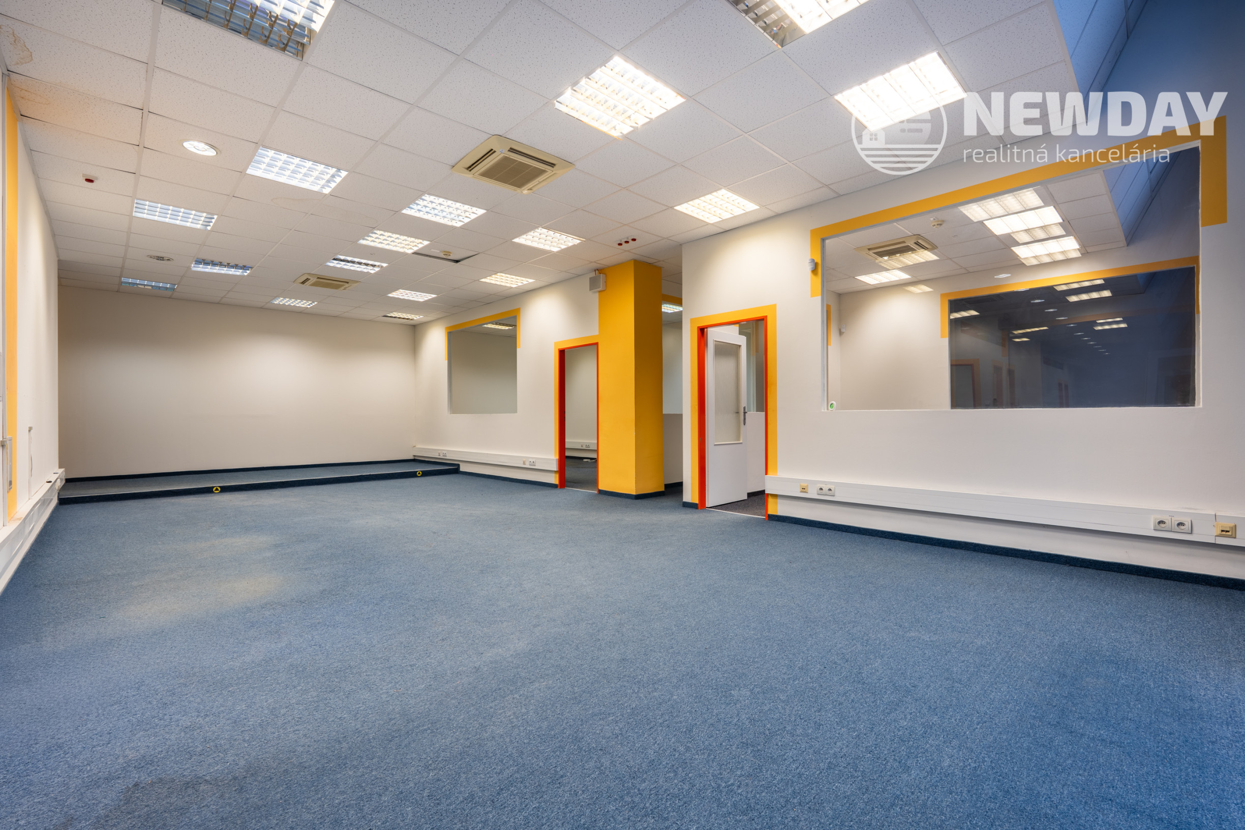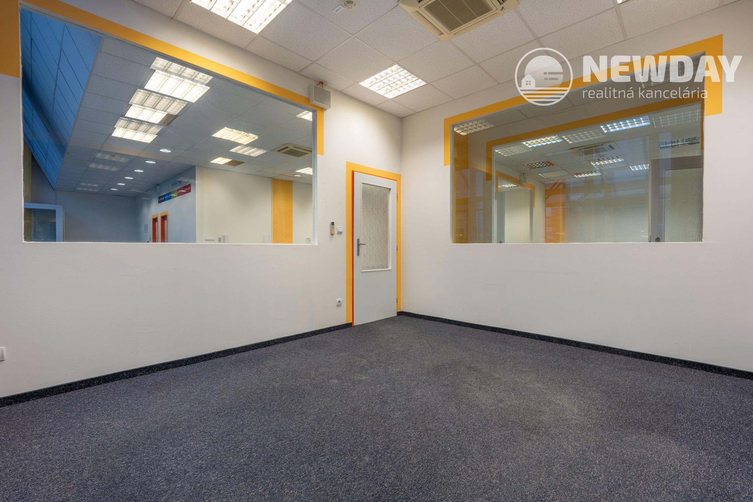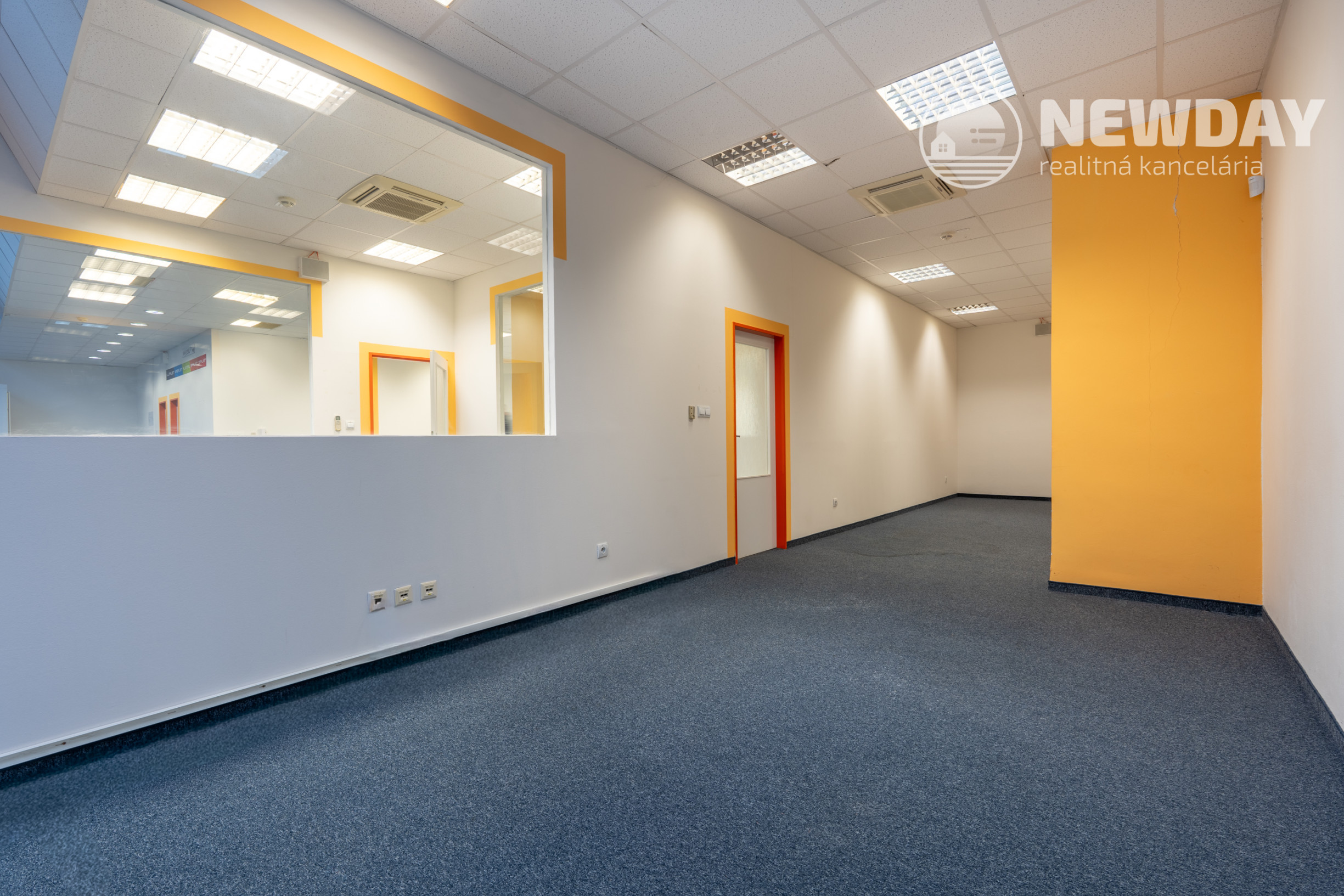 Kancelárie sú oddelené sadrokartónovými priečkami s veľkým podielom skla, čo zabezpečuje dostatok svetla a vizuálnu otvorenosť priestoru.